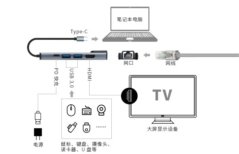 一機(jī)多用,MiraSceen Type-c多功能擴(kuò)展塢包含有HDMI投屏/USB擴(kuò)展/PD快充/有線網(wǎng)口,