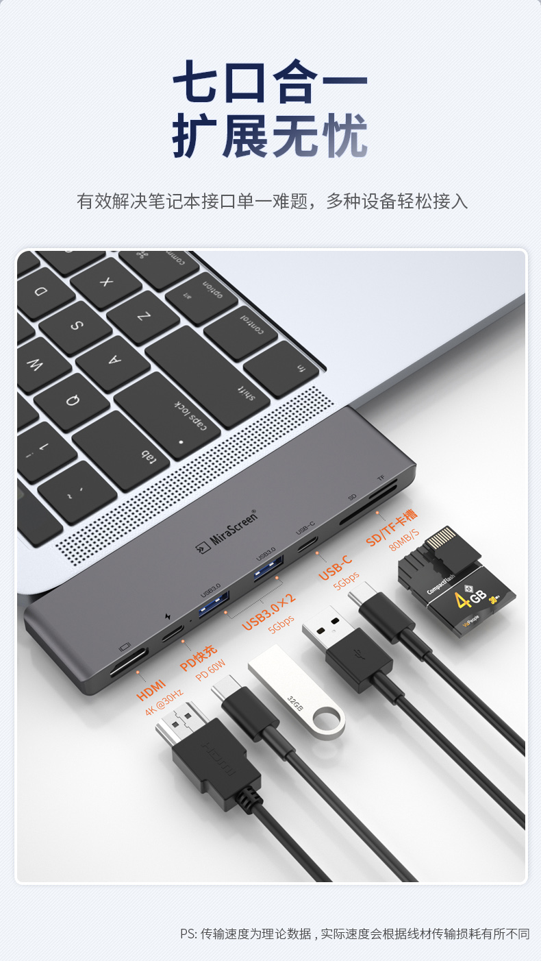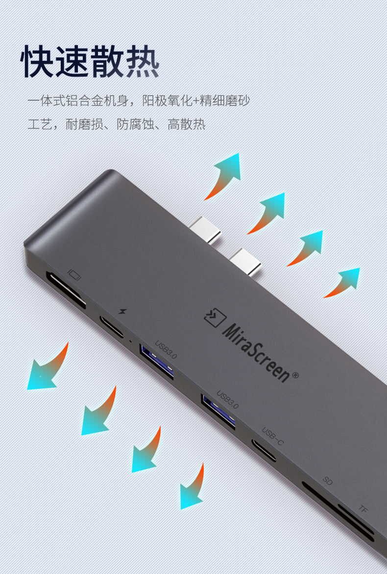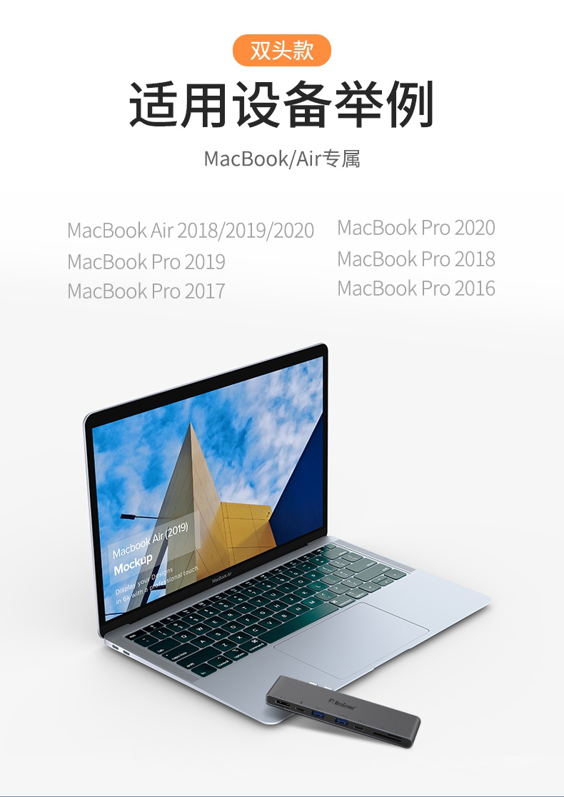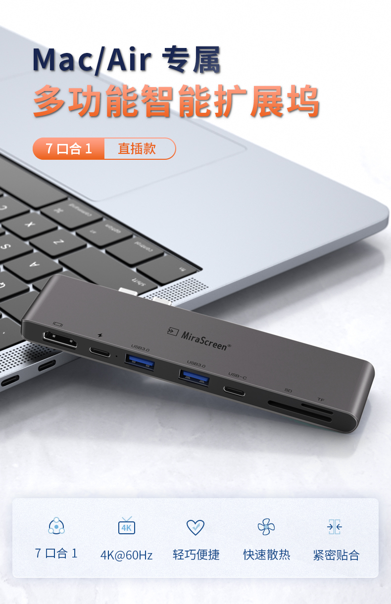 Mac/Air專(zhuān)屬多功能智能擴(kuò),量身定制,接口7口合1,雙接口一對(duì)一接入,親密無(wú)間不留縫隙,穩(wěn)固牢靠不松動(dòng),投屏、擴(kuò)展皆適宜,給你想要的方便?。。?/p>
