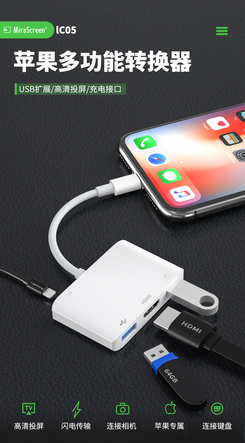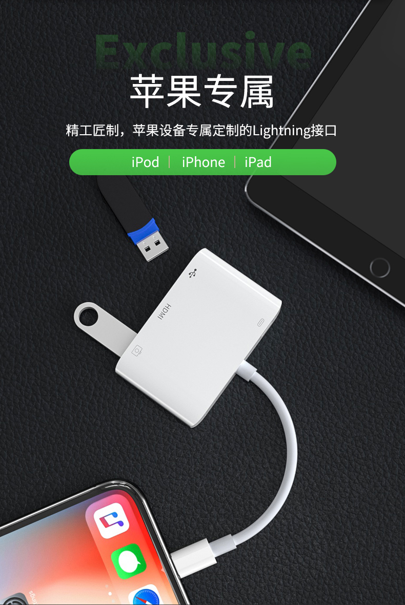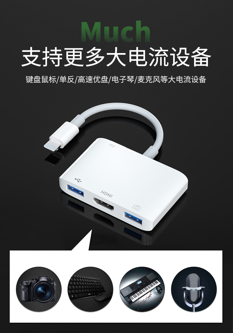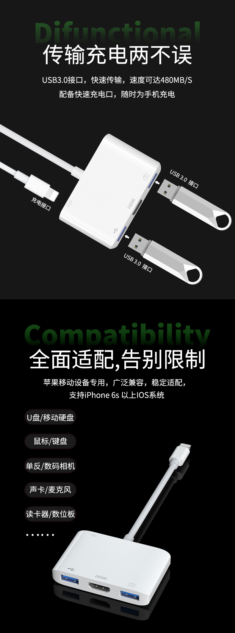 蘋果專屬多功能轉(zhuǎn)換器,可充電,連接鼠鍵,U盤等,HDMI可直接連接大屏,將手機(jī)/平板內(nèi)容投至大屏,辦公/游戲/觀影極佳體驗(yàn)