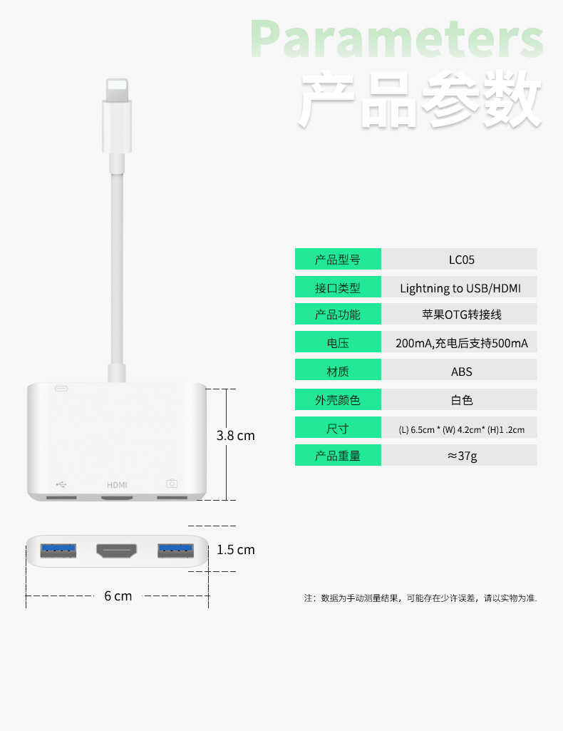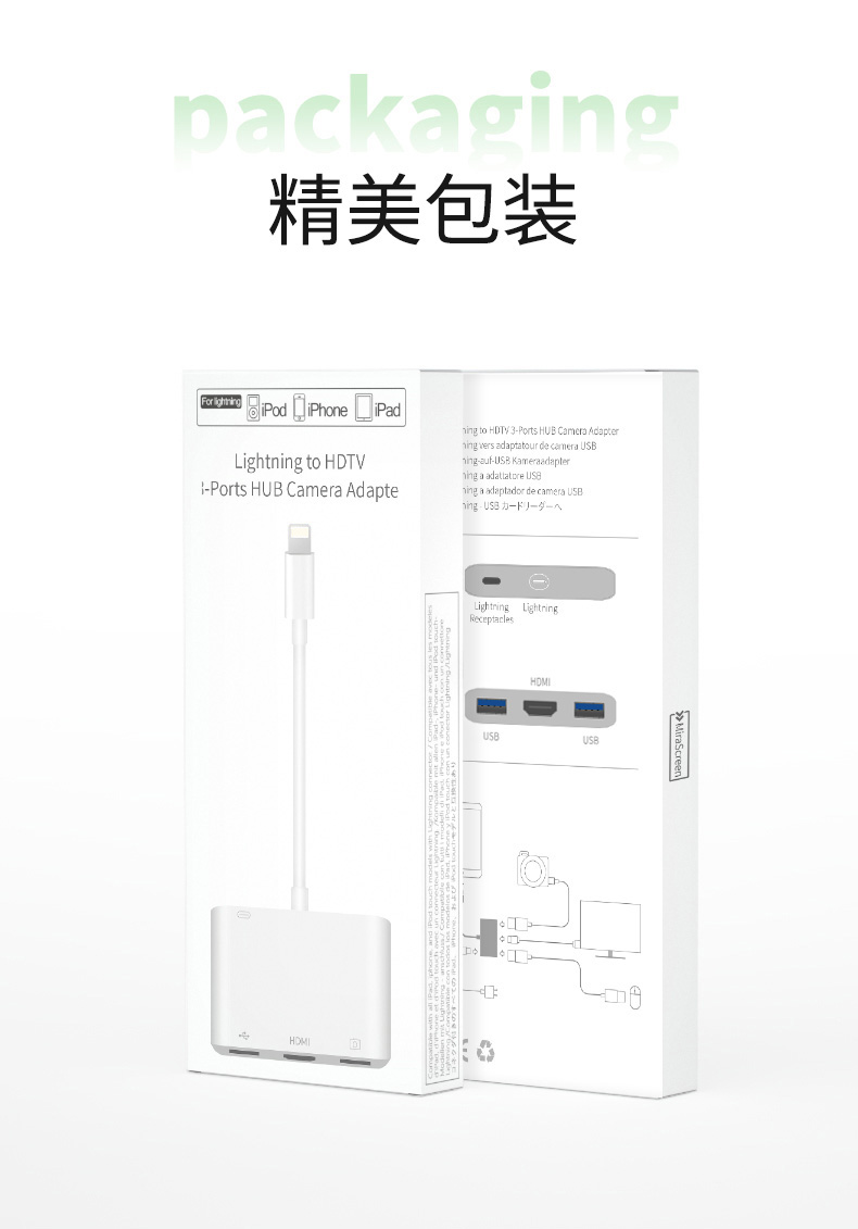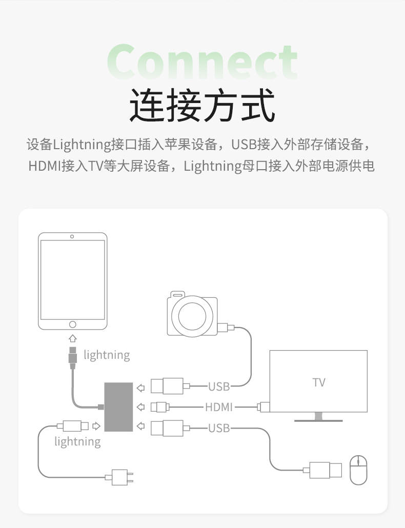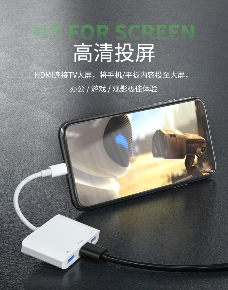 蘋果專屬多功能轉(zhuǎn)換器,可充電,連接鼠鍵,U盤等,HDMI可直接連接大屏,將手機(jī)/平板內(nèi)容投至大屏,辦公/游戲/觀影極佳體驗(yàn)