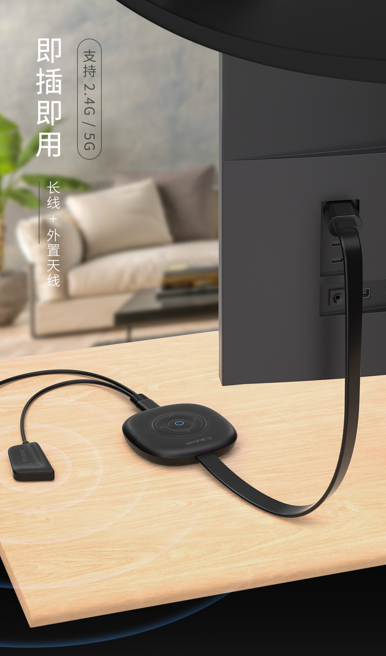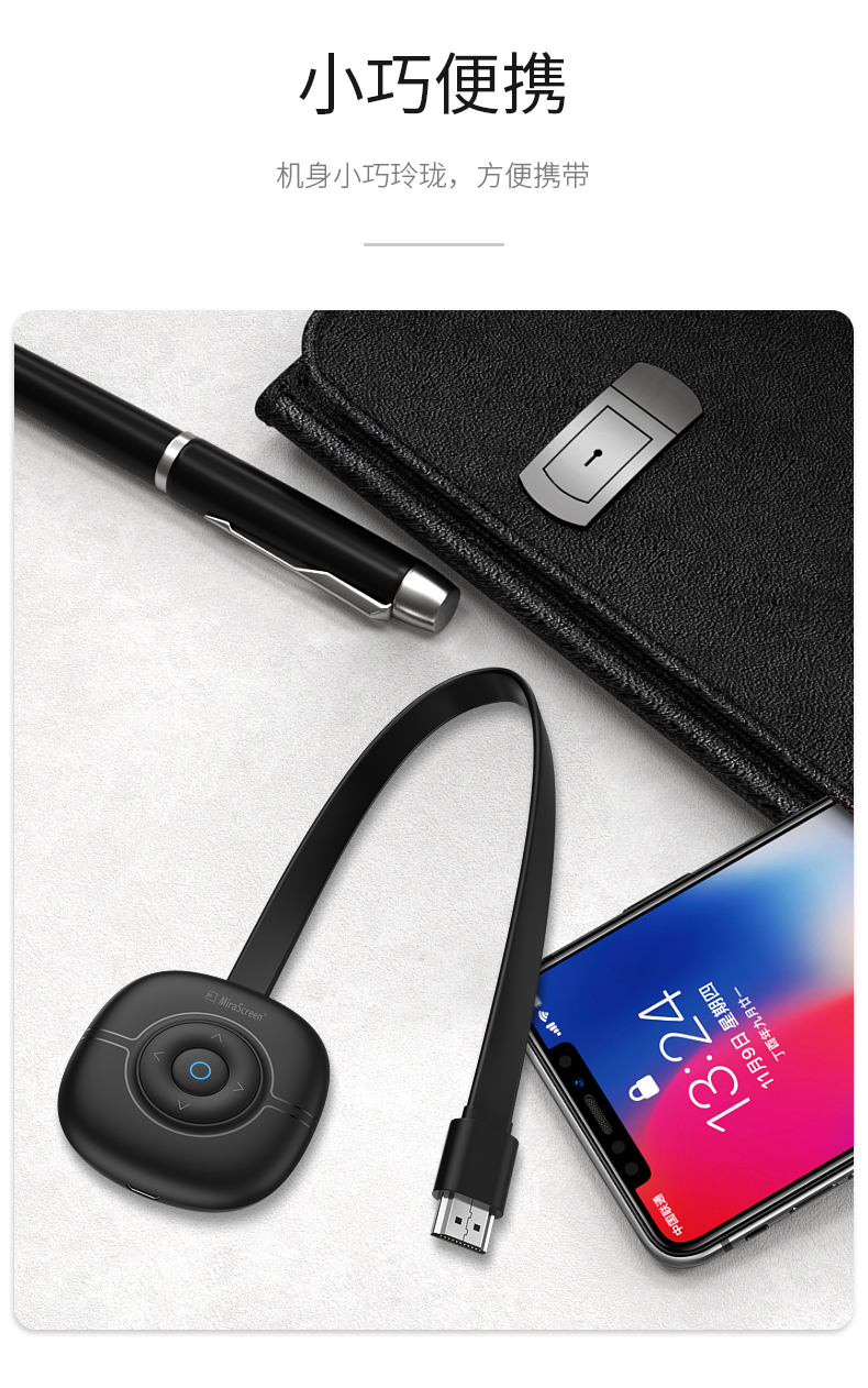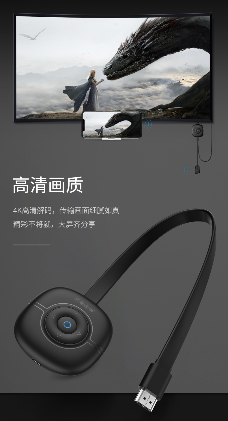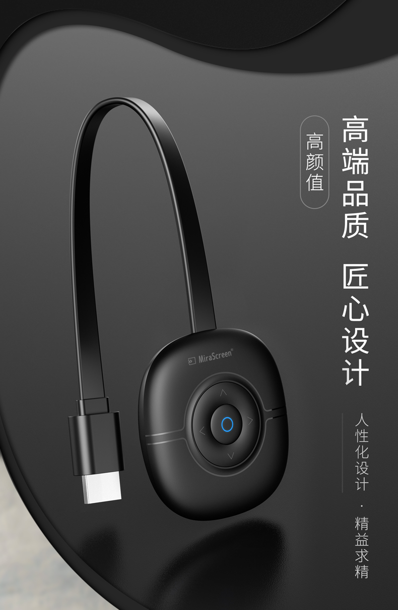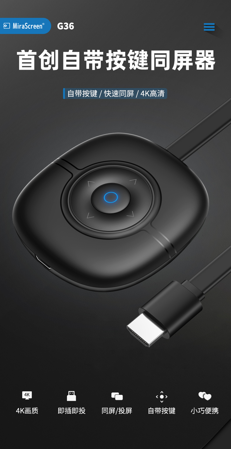 MiraScreen G36 無線同屏器內(nèi)置智能芯片,4A高清畫質(zhì),高效穩(wěn)定,場景應(yīng)用多元化,擁有強(qiáng)大的影音播放系統(tǒng)。凸起按鍵設(shè)計(jì),手感舒適,簡單實(shí)用。