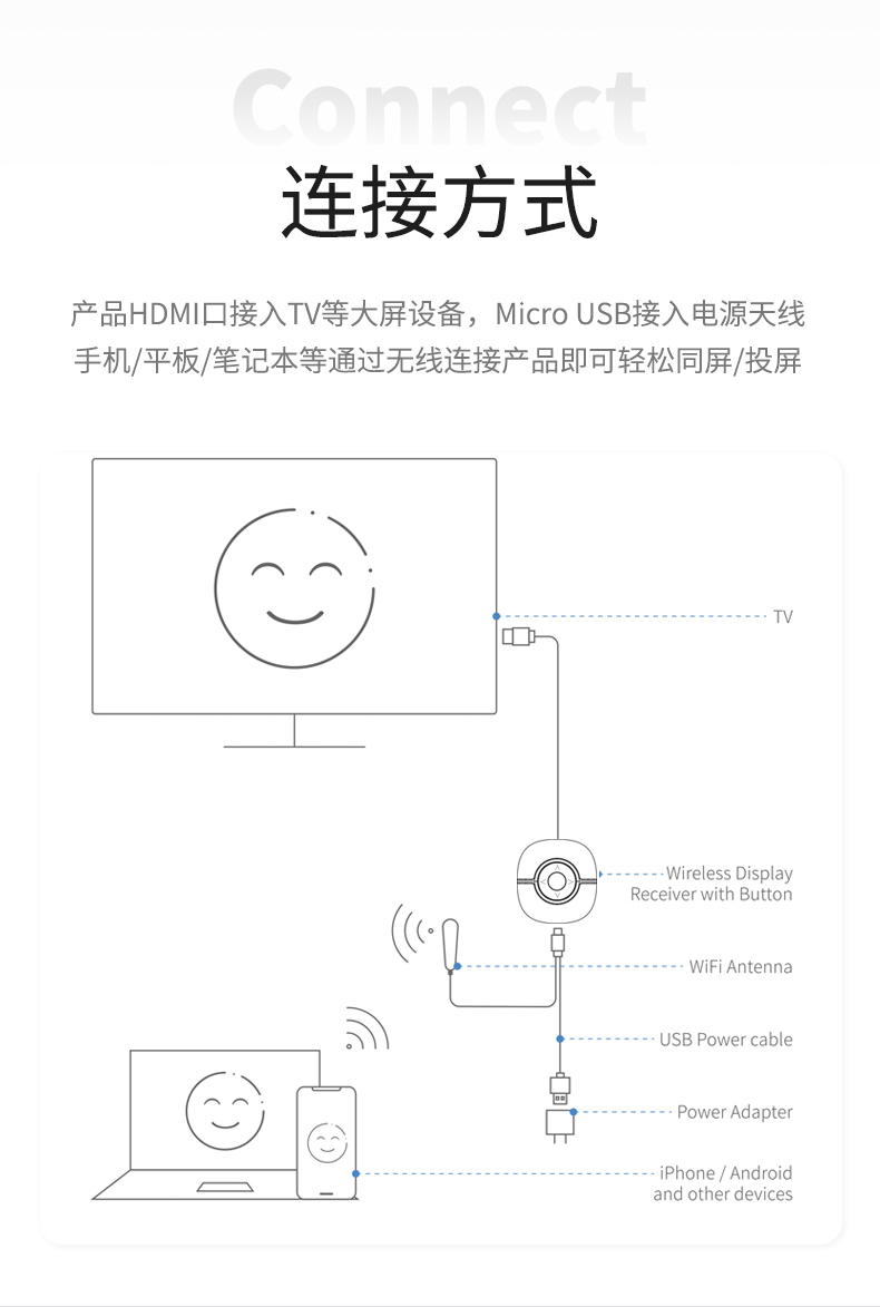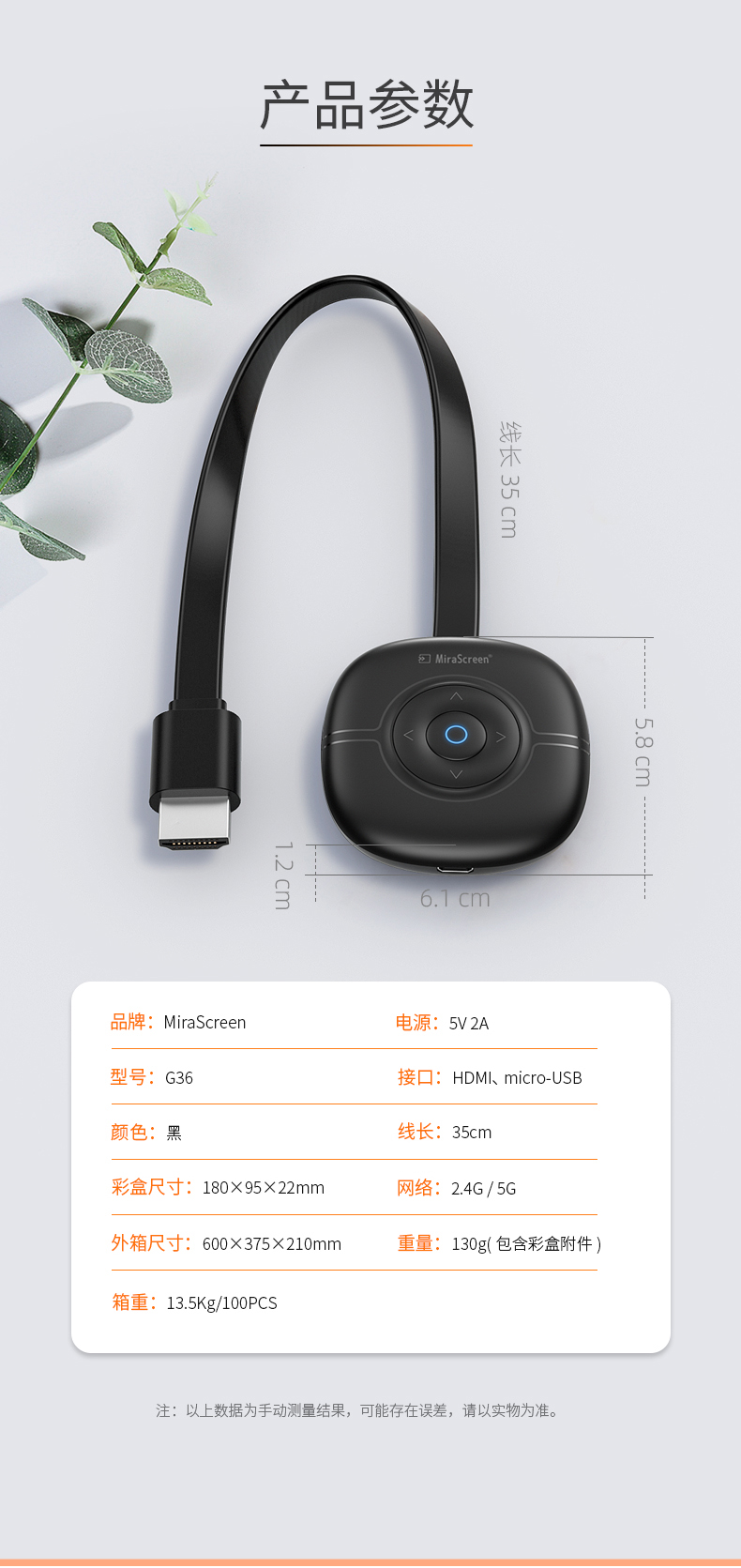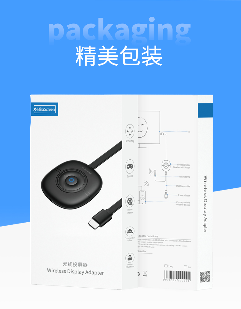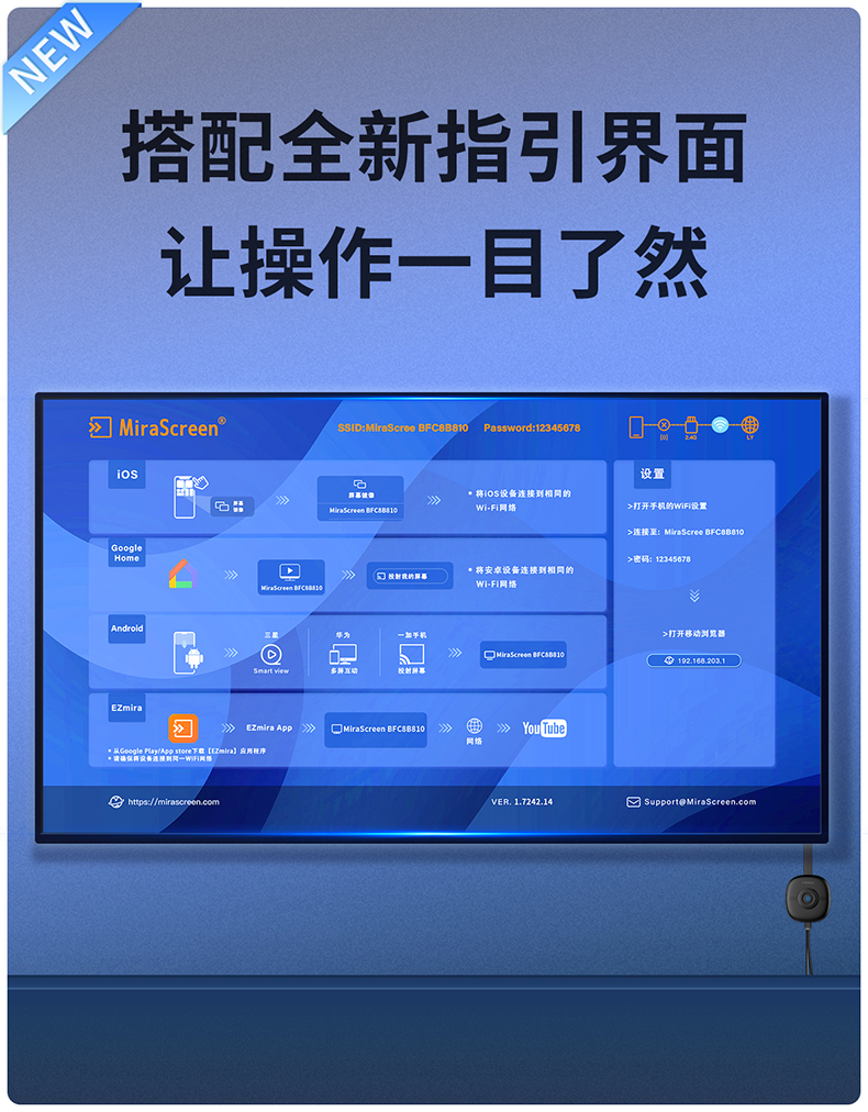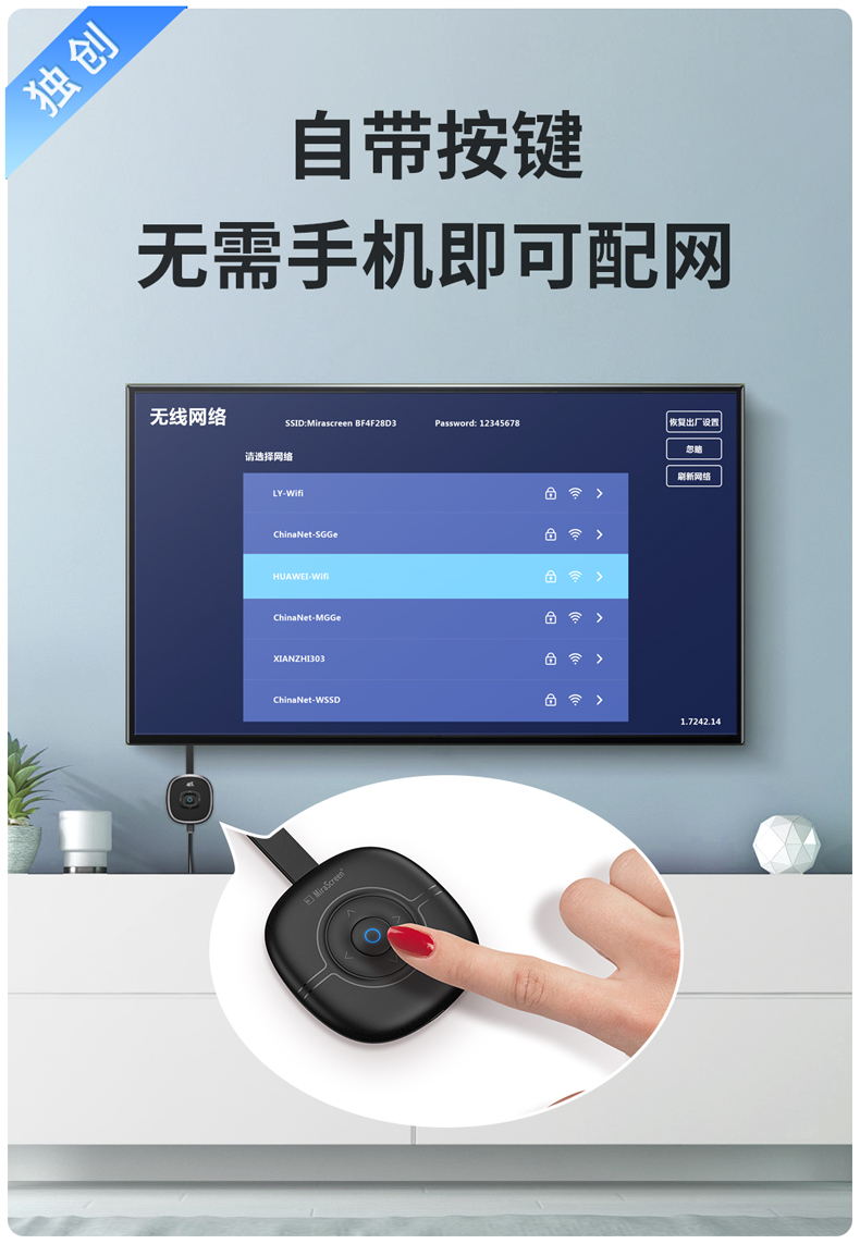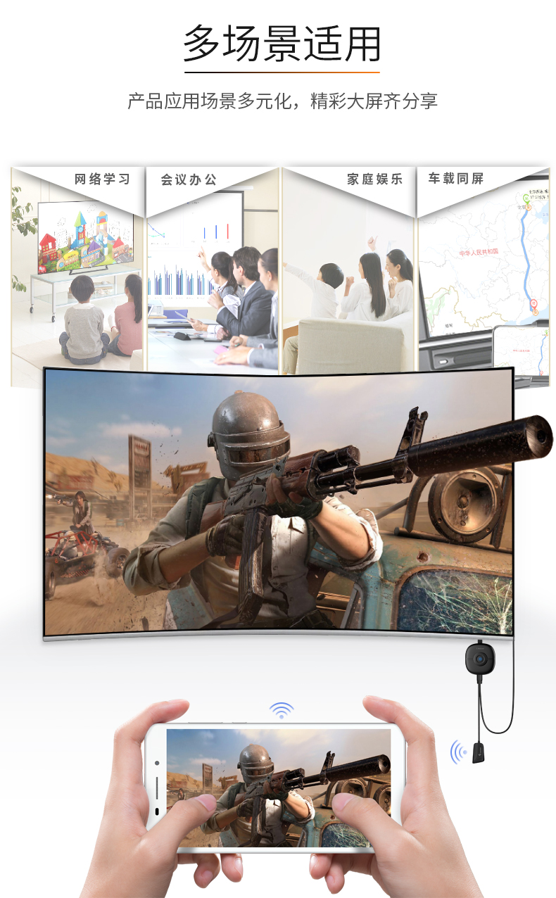 MiraScreen G36 無線同屏器內(nèi)置智能芯片,4A高清畫質(zhì),高效穩(wěn)定,場景應(yīng)用多元化,擁有強(qiáng)大的影音播放系統(tǒng)。凸起按鍵設(shè)計(jì),手感舒適,簡單實(shí)用。