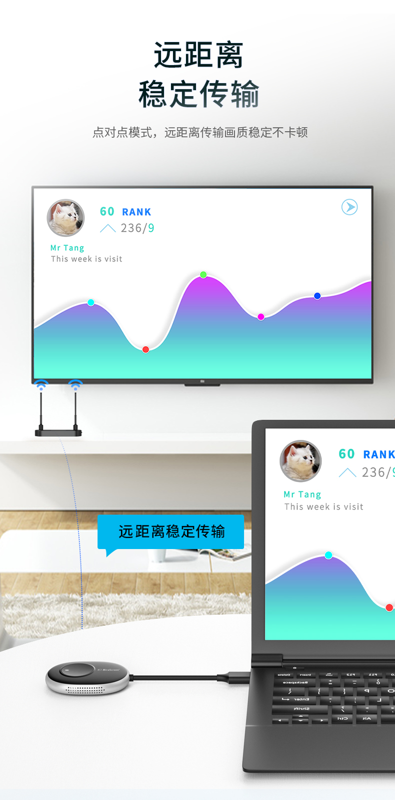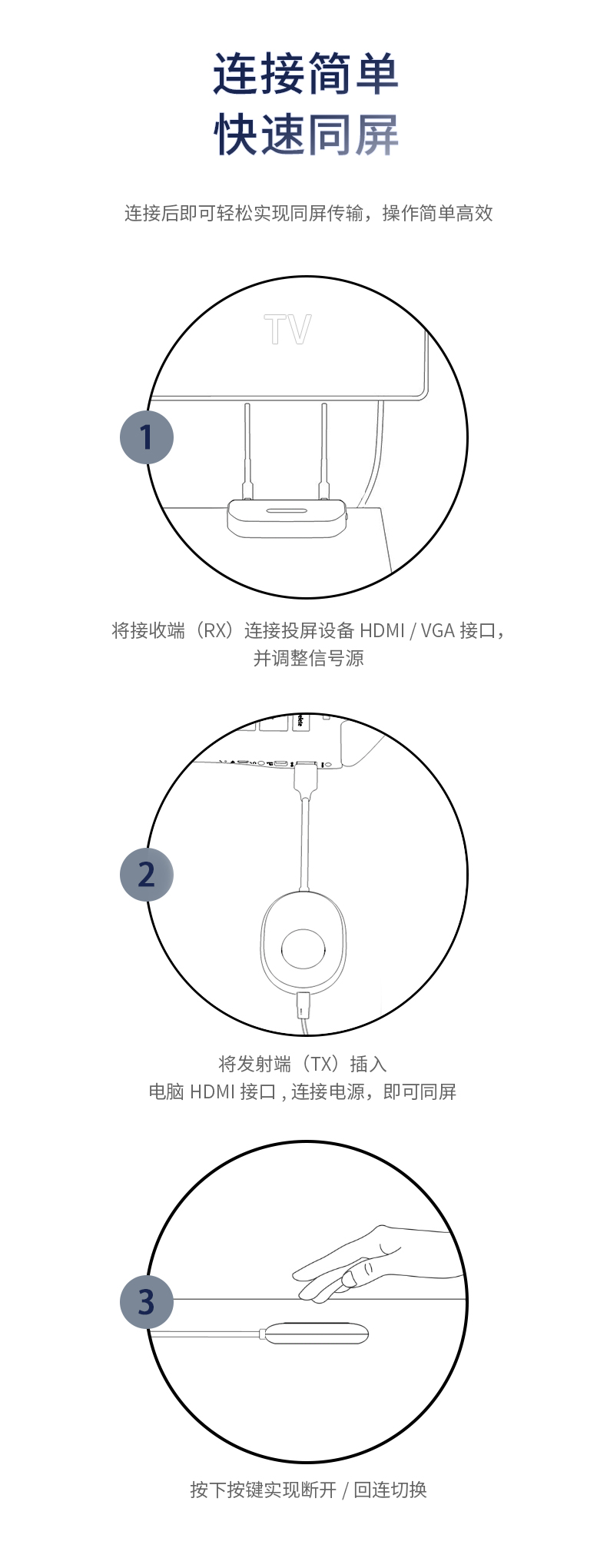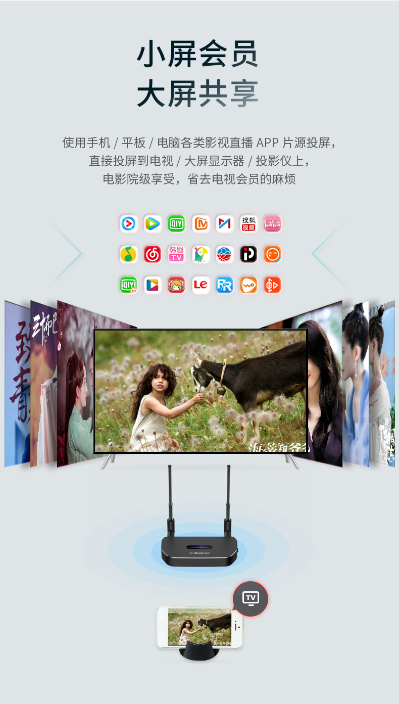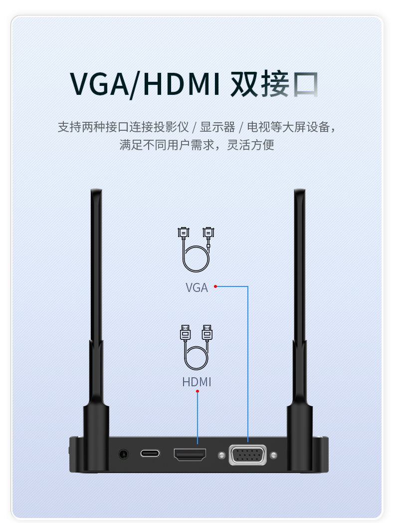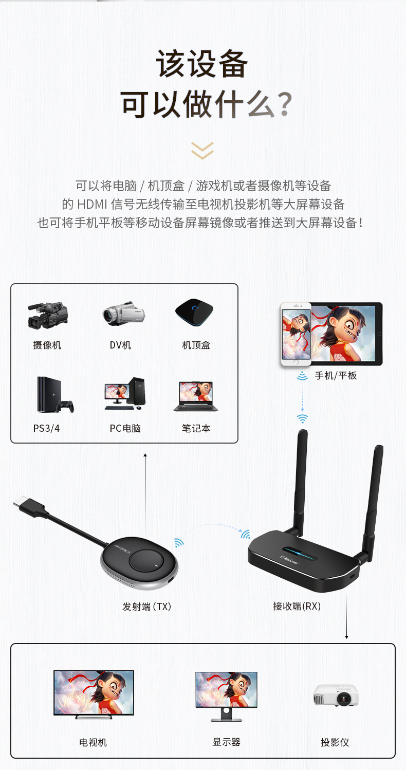 即插即用,會議更高效,可將電腦/機(jī)頂盒/游戲機(jī)等設(shè)備的HDMI信號無線傳輸至電視機(jī)、投影機(jī)等大屏設(shè)備,也可將手機(jī)/平板等移動設(shè)備屏幕鏡像或推送到大屏設(shè)備!