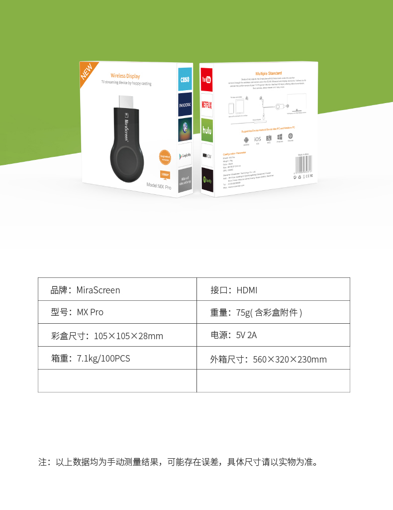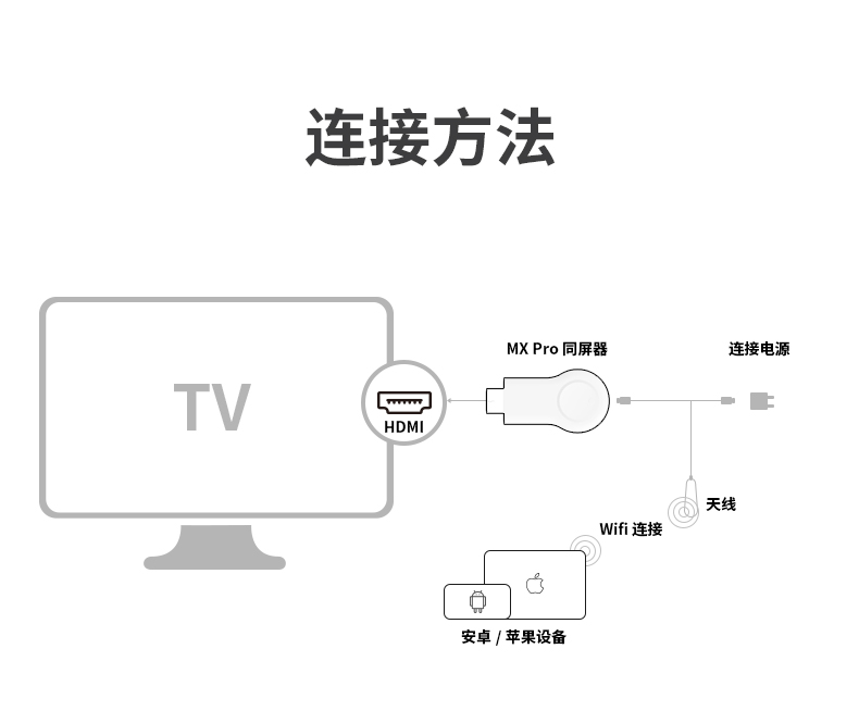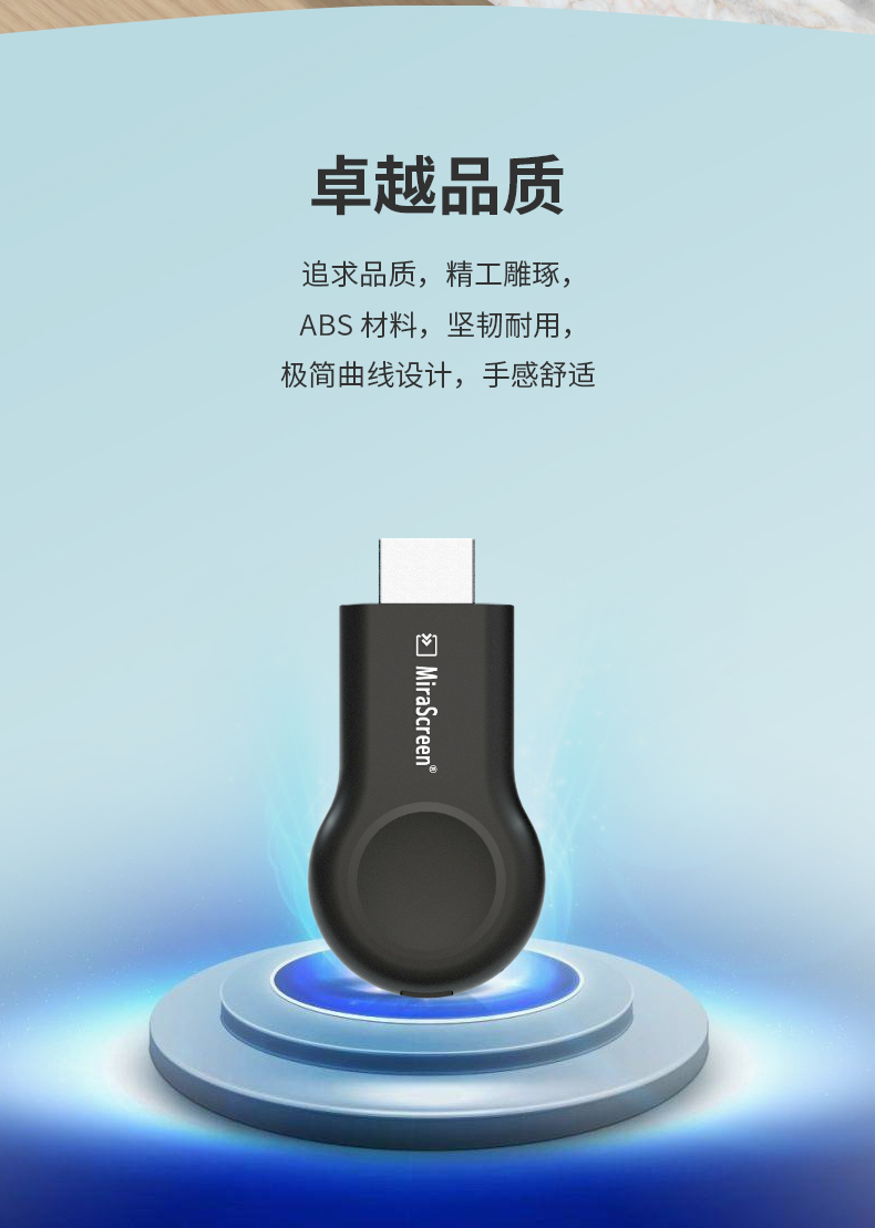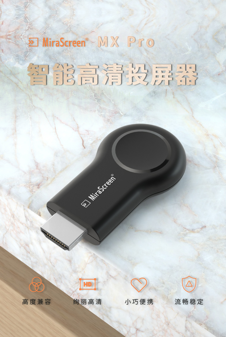 MiraScreen MX-Pro 是一款無線同屏器。設(shè)計(jì)輕巧圓潤,輕巧便攜,讓您簡易的把手機(jī), 平板及筆記型電腦的畫面投影到電視機(jī)或投影機(jī)上,簡單, 穩(wěn)定, 多用, 搞定所有設(shè)備!為您提供卓越的觀看體驗(yàn)!